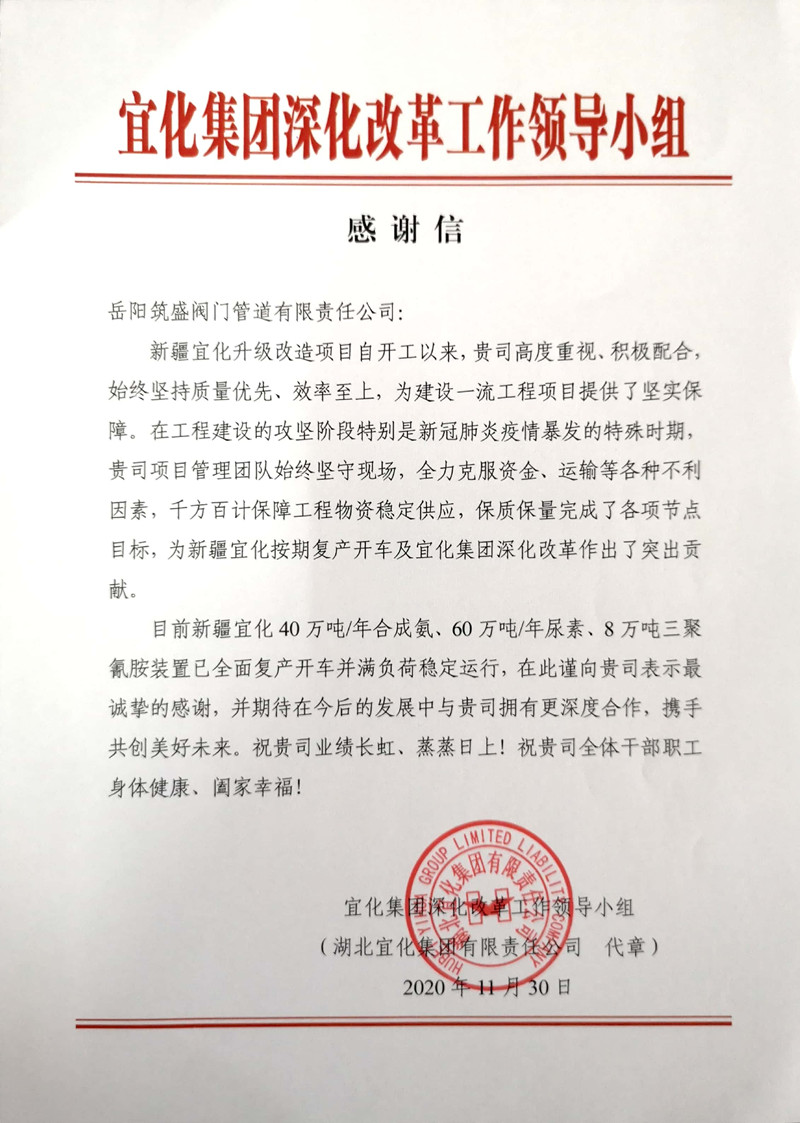 岳陽筑盛閥門管道有限責任公司收到宜化集團感謝信