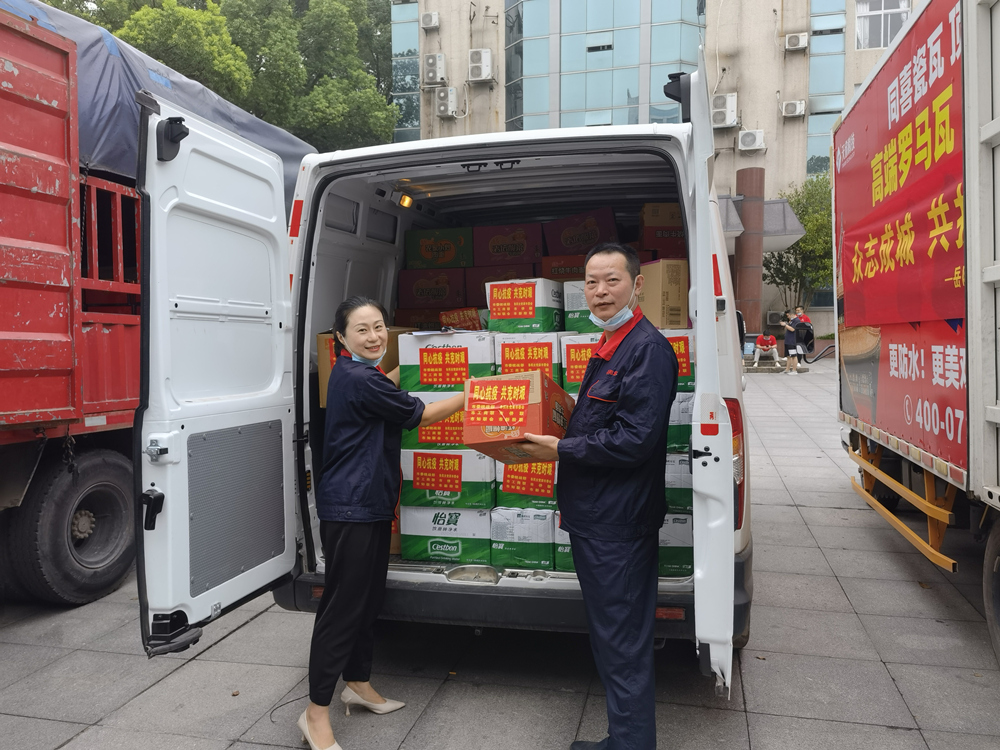 圖為:岳陽筑盛閥門管道有限責(zé)任公司董事長(zhǎng)鄧晴正在搬運(yùn)捐贈(zèng)物資。